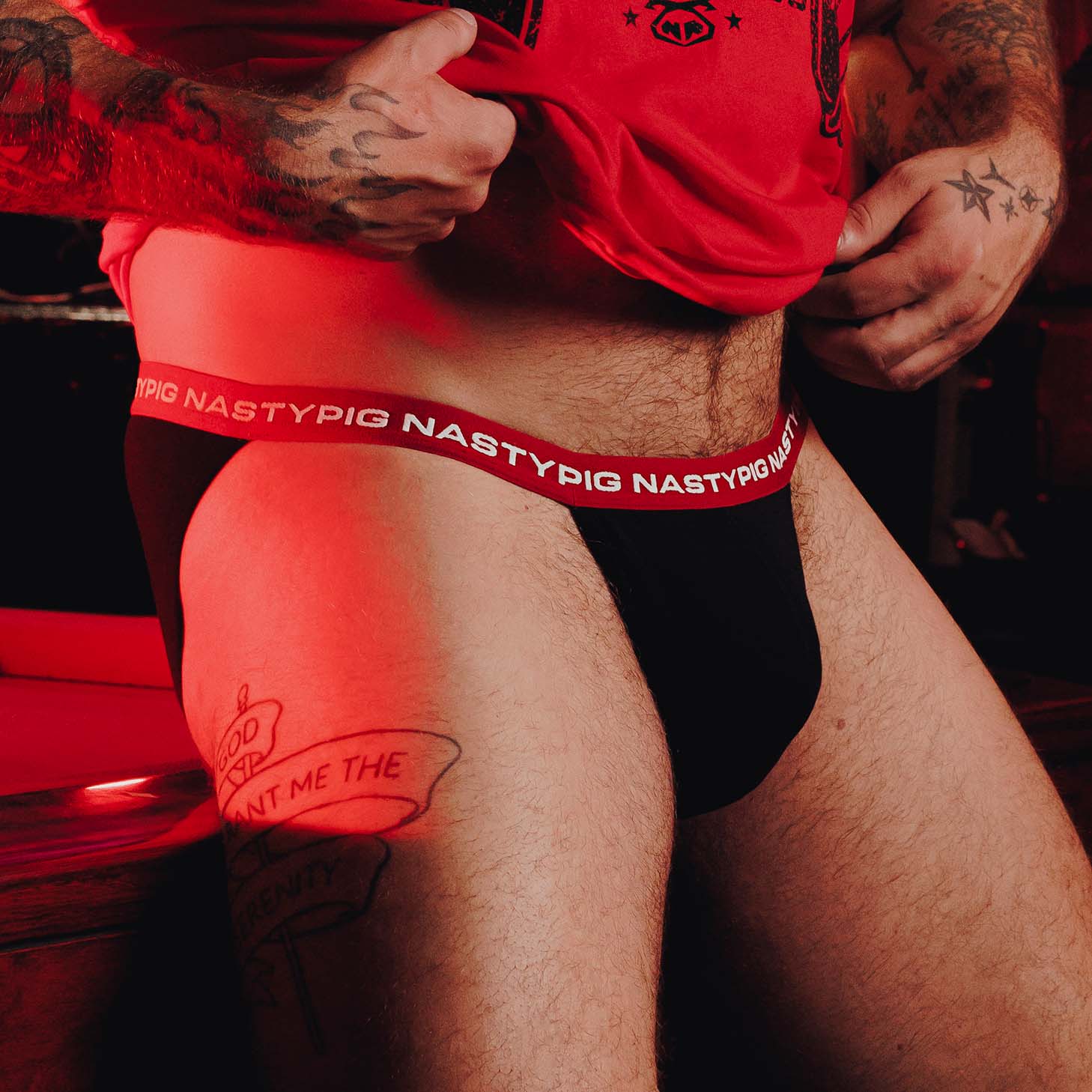 The Lift Club Thong isn’t subtle—and that’s the point. With its sleek black body, bold red waistband, and signature NASTYPIG branding, it’s built to show off. A contoured pouch keeps you supported up front while the back leaves nothing to the imagination. Whether you're lifting at the gym or lifting brows in the locker room, this thong commands attention and keeps it.