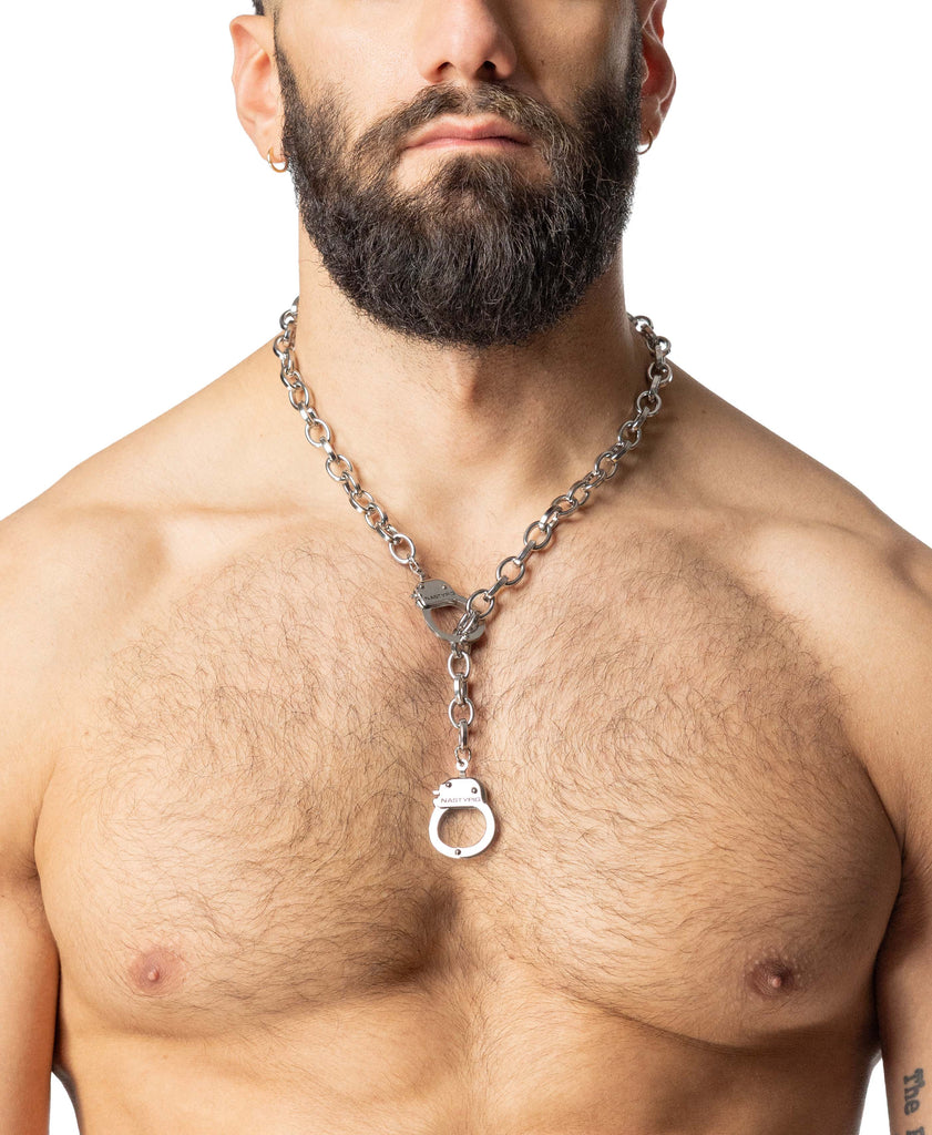 This heavy-duty chain doesn’t just accessorize—it teases, tempts, and takes control. With custom Nasty Pig handcuff hardware front and center, it's built to show you're ready for a wild night (or a few). You’re not here to behave—and this chain makes sure no one else does either. Time to cuff it up, baby.